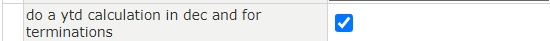 The "do a ytd calculation in dec and for termination" company setting can be enabled on the Statutory Fields tab on the Basic Company Profile screen to validate the above