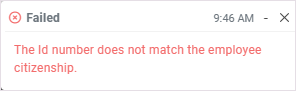 How I resolve the error "The ID number does not match the employee citizenship"?