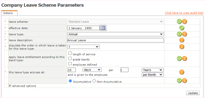 Navigate > Configuration > Human Resources > Leave Administration > Leave Scheme Parameters