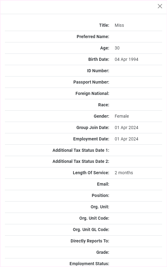 This feature is available on all PaySpace editions Click on an employee’s name in the Location Menu on the top left corner, to view a summary of the employee’s details. Employee > Location Menu