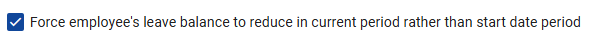 To have future dated leave applications reduced from the current period's leave balance, enable the "Force employee's leave balance to reduce in current period rather than start date period" checkbox under the Leave Calculations section on the Leave Settings screen.