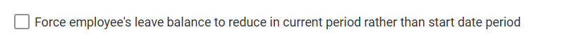 To have future dated leave applications reduced from the period's leave balance that it will be taken, disable the "Force employee's leave balance to reduce in current period rather than start date period" checkbox under the Leave Calculations section on the Leave Settings screen.
