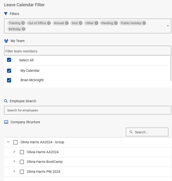 The "Filters" option allows users to filter the information they wish to view on the Leave Calendar. The filters may be applied based on out of office, training, leave types, birthdays, public holidays, company (applies to companies within a group), or organisation units.