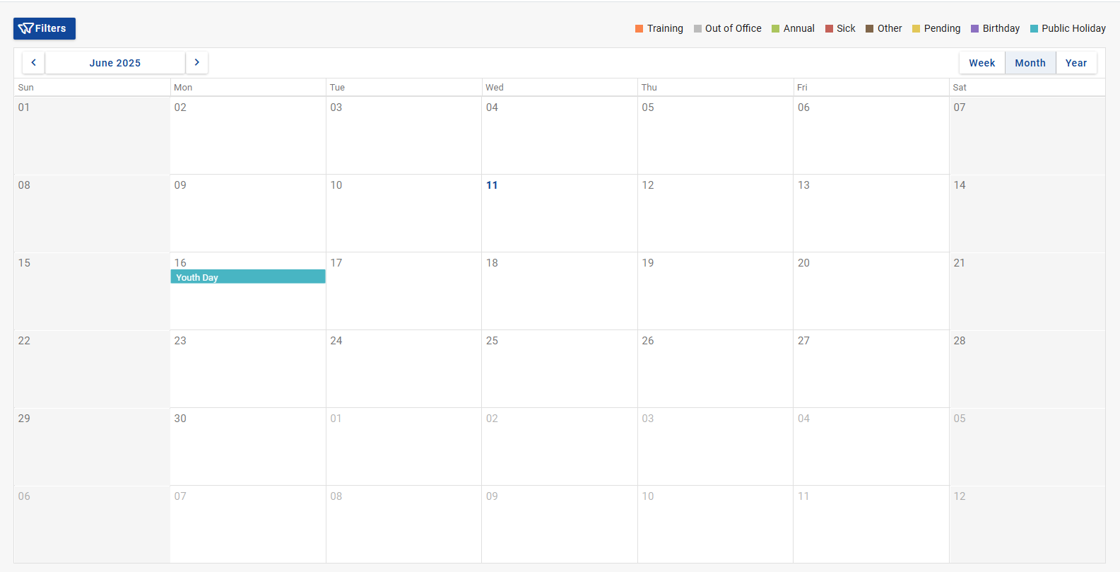 The Leave Calendar will display users who are on leave and will group the leave days according to the leave type, i.e., Holiday leave, Sick Leave etc. The Leave Calendar displays birthdays, users who are out of office, training and public holidays as well. These can be identified based on the color-coded options shown on the top right of the screen.