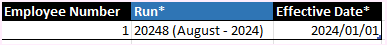 Another example would be as follows: The current Open Run is August 2024. A backdated pay rate record is processed with an Effective Date, 1 January 2024 on the Pay Rate Details Screen. The retroactive calculation will only be applied from March to June, ignoring January and February.