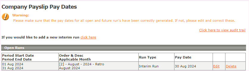 Once the spreadsheet is successfully uploaded, an interim run will be automatically created on the Payslip Pay Date screen.