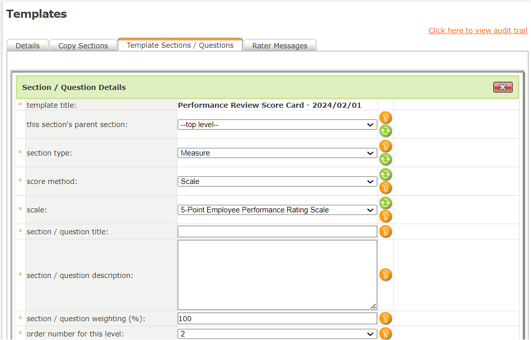 Template sections / questions can be created and maintained on the Template Definition screen.