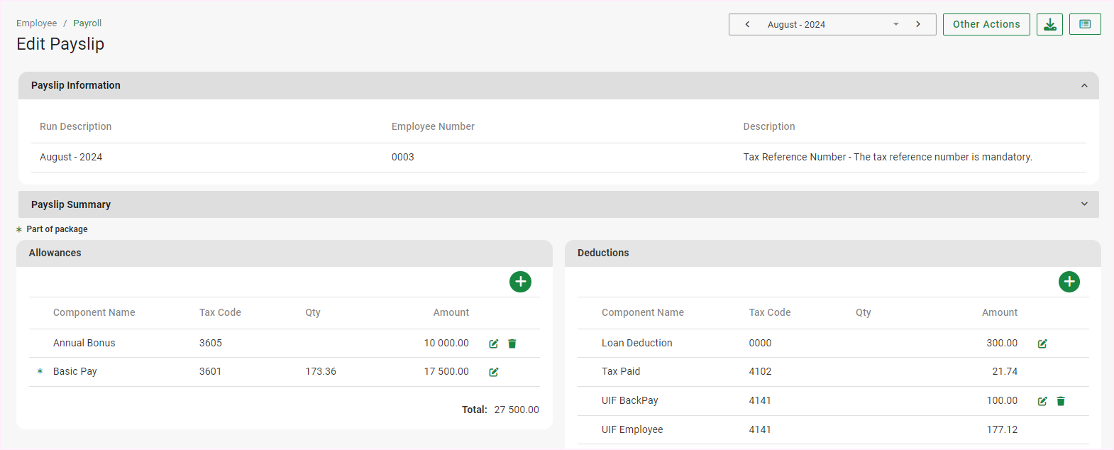 Navigate > Employee > Payroll Processing > Edit Payslip