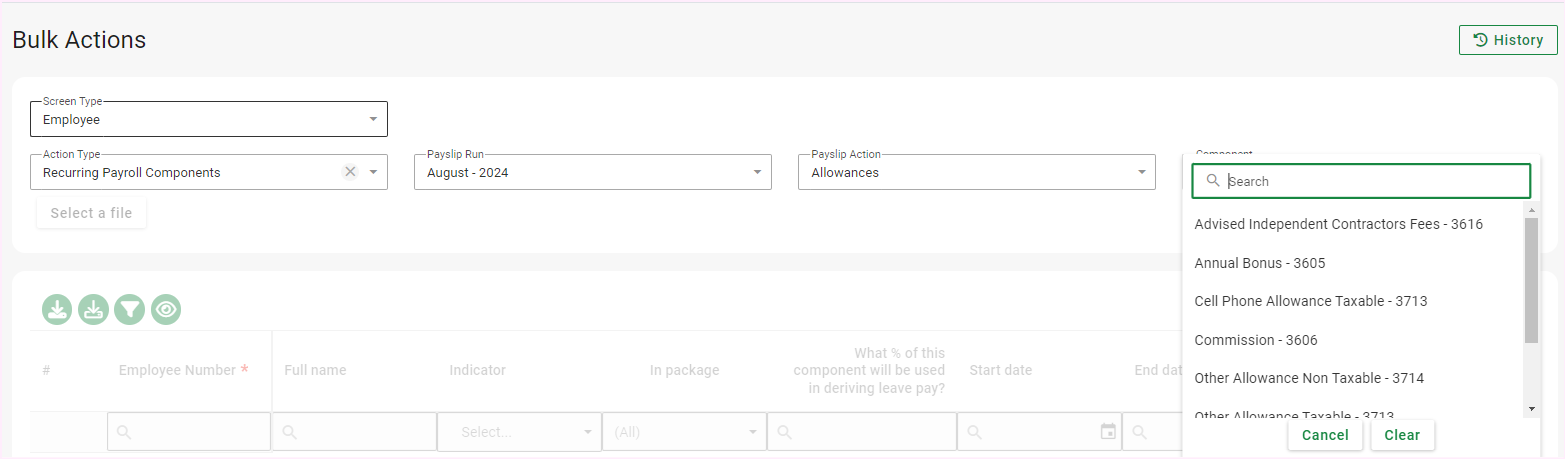 Option 2: The Bulk Action screen - This function allows employees to be linked to the specified Recurring component in bulk.