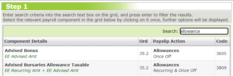 Depending on the type of component being searched for when adding a new one, the system will specify whether it is a Recurring component in the "Payslip Actions" column.