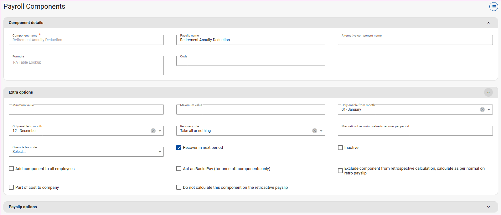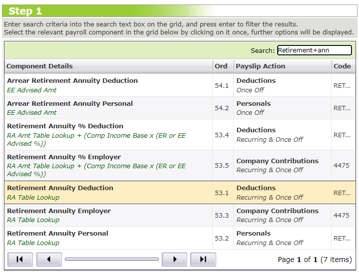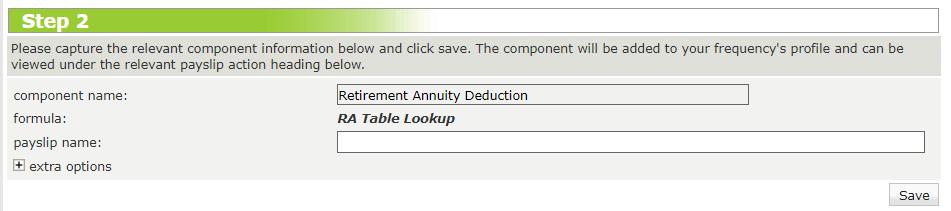 A Retirement Annuity component has to be created on company level, before it can be added to an employee/s.