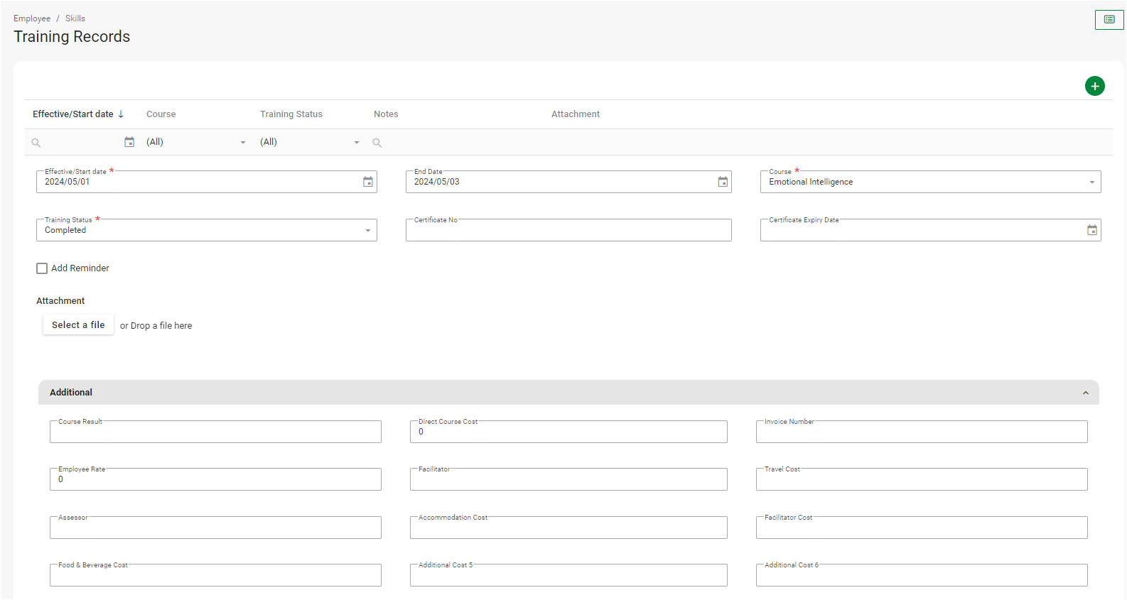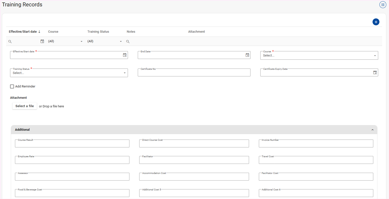 Once a training course has been created on company level, employees can enroll to a scheduled course. Besides allowing employees to enroll to scheduled Training Courses, company level users can also add a training course directly on the Training Records screen.