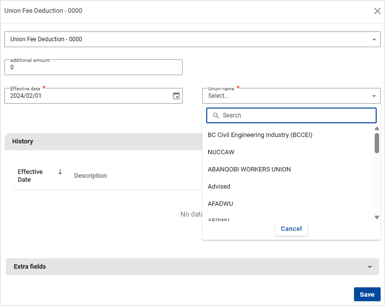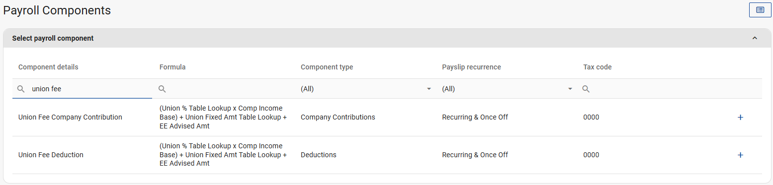 The Union Fee deduction and/or company contribution components can be added onto an employee's payslip as a once-off component or onto their Recurring Payroll Components screen as a recurring component. However, the components have to be created on company level first.