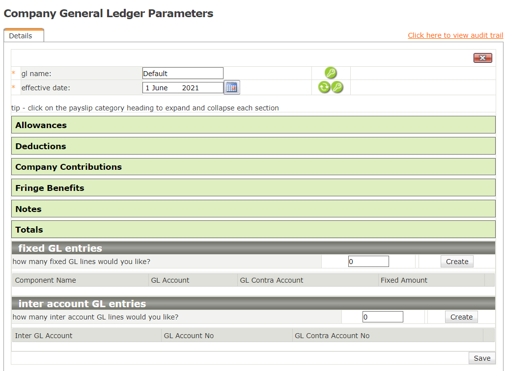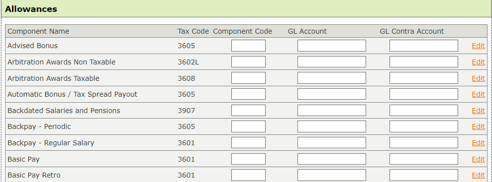 Edit the applicable GL Account and GL Contra Account codes listed next to applicable component.