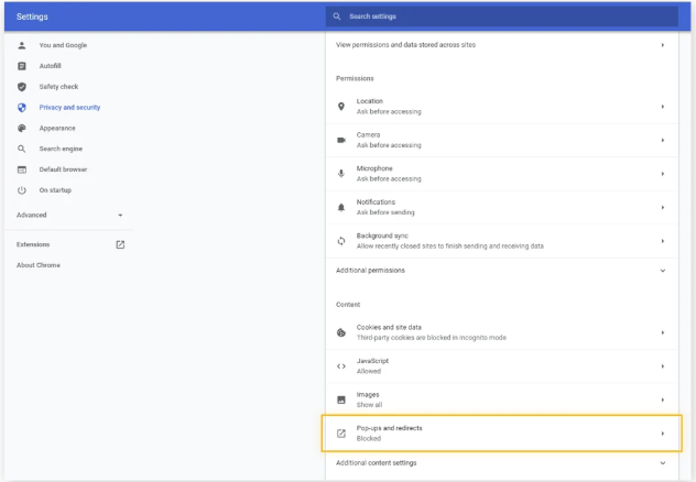 4.Scroll down and click Pop-ups and redirects.