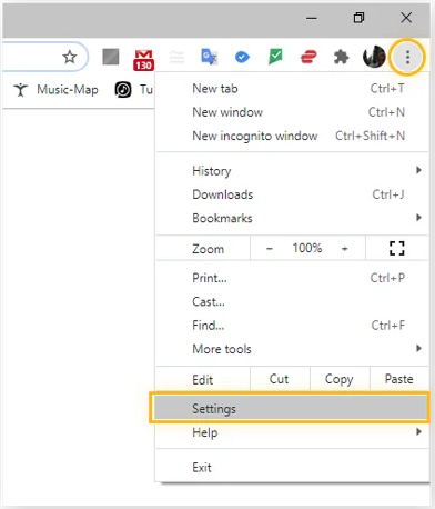 - Open the Chrome browser, click the three dots in the upper-right corner, and then click Settings.