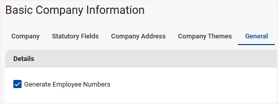 Step 3: Enable the "generate employee numbers?" checkbox on the Basic Company Information screen.