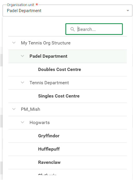 An employee's organisation unit can be changed on the Position screen, by selecting the new unit from the dropdown list in the Organisation unit field.