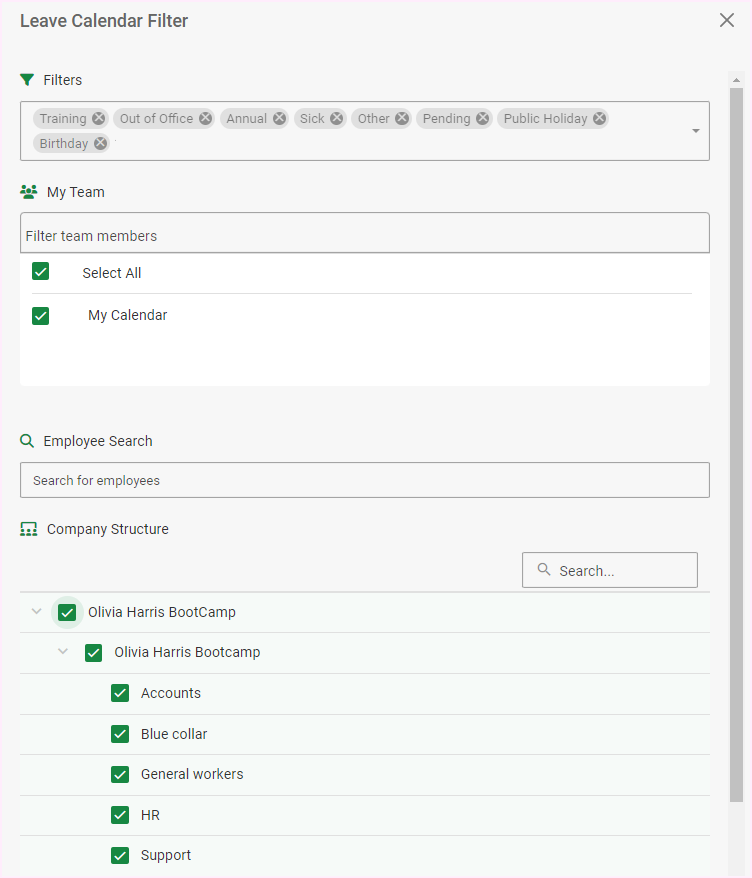 Step 2: Select and specify the Filters and select the entire company on the company structure search bar to view the entire company's leave.