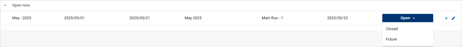 To close a run, click on the status box and select Closed from the dropdown. Runs can be closed at any time.
