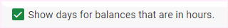 - The below checkbox available on the Leave Balances screen would need to be enabled to reflect the balance in hours.