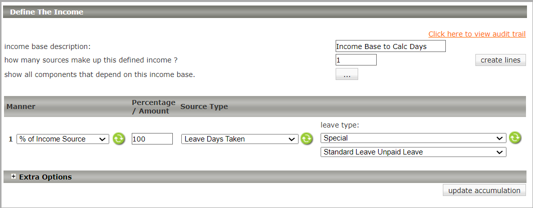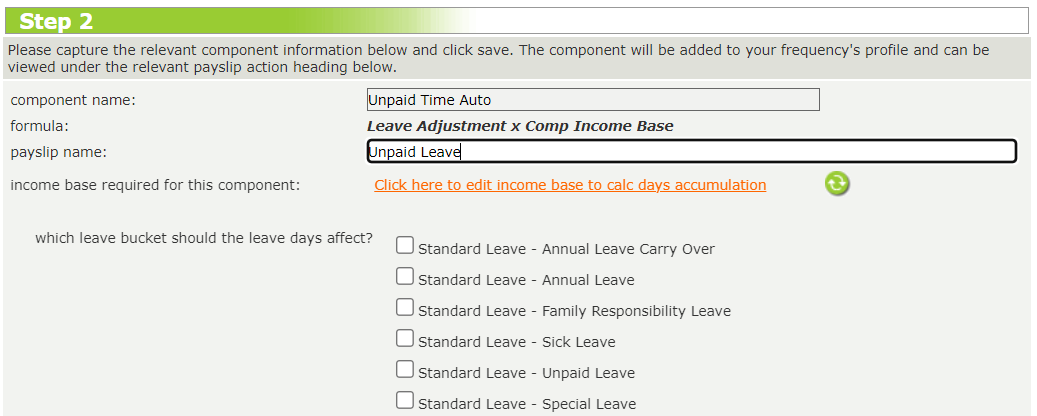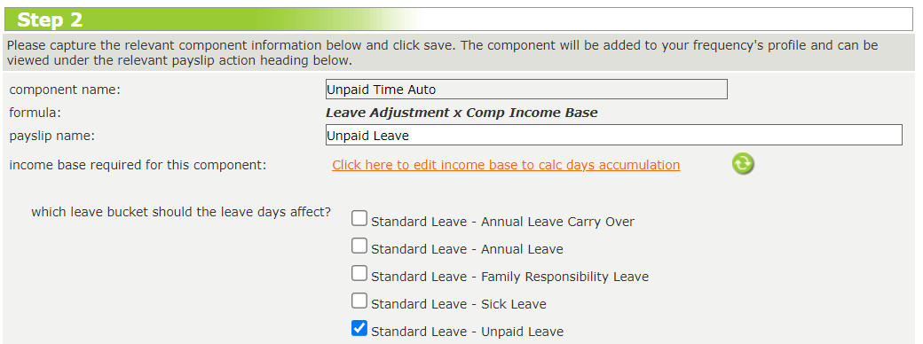 After the income base is defined, select the Unpaid Leave parameter under the "which leave bucket should the leave days affect?".