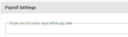 Insert the number of days that a run should be closed before its pay date is reached in the "Close runs this many days before pay date" field under the Payroll Settings section on the General Settings screen.