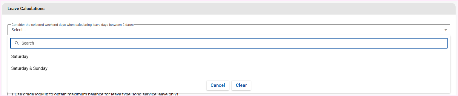 Navigate > Config > Human Resources > Leave Administration > Leave Settings > Leave Calculations
