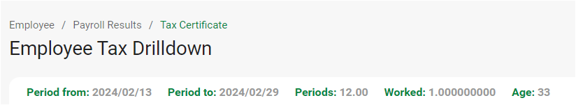 The employees' Tax Certificates / Historical Drill Down screen will show that the Periods Worked value has changed from 0.709677419 to 1.