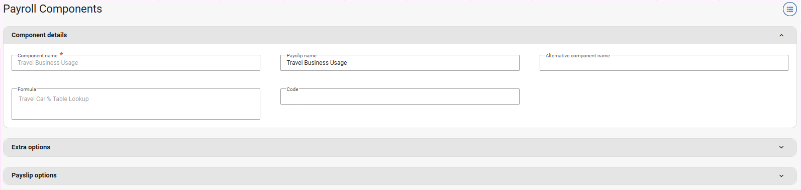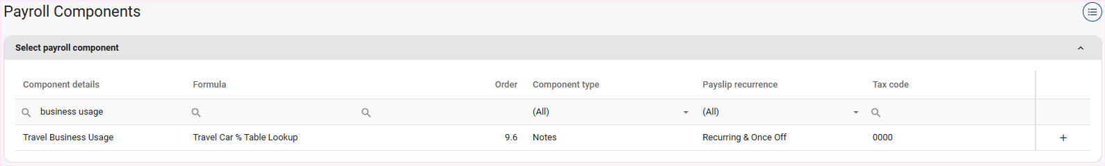 Should an employee's Travel Allowance component be taxed at 20%, add the Travel Business Usage note component to either their Edit Payslip or Recurring Payroll Components screens and specify at which percentage it must be taxed.