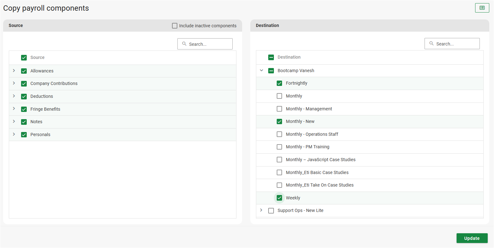 Payroll components can be copied between frequencies within a company on the Copy Payroll Components screen.