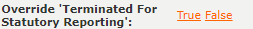 Should this checkbox be mistakenly passed over during the transfer, select the "True" hyperlink against the Override 'Terminated For Statutory Reporting': option on the Transfer History screen, which will enable the "Terminated for Statutory reporting" field (sets it to "True").