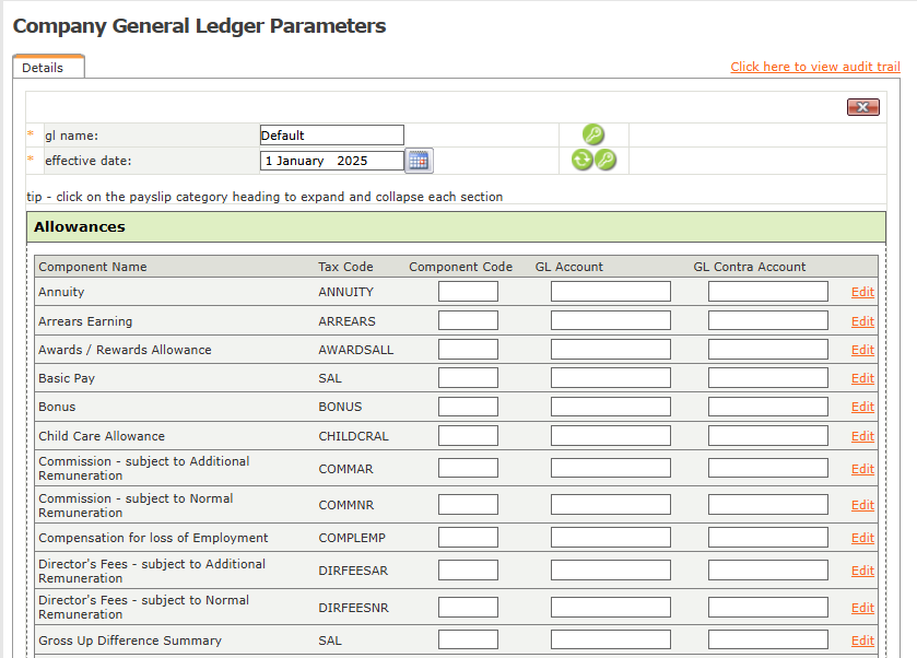 This feature is available on all Deel Local Payroll powered by payspace payroll editions General Ledger entries can be created on the General Ledger Parameters screen. Navigate > Configuration > Payroll > Payroll Config > General Ledger Parameters ...