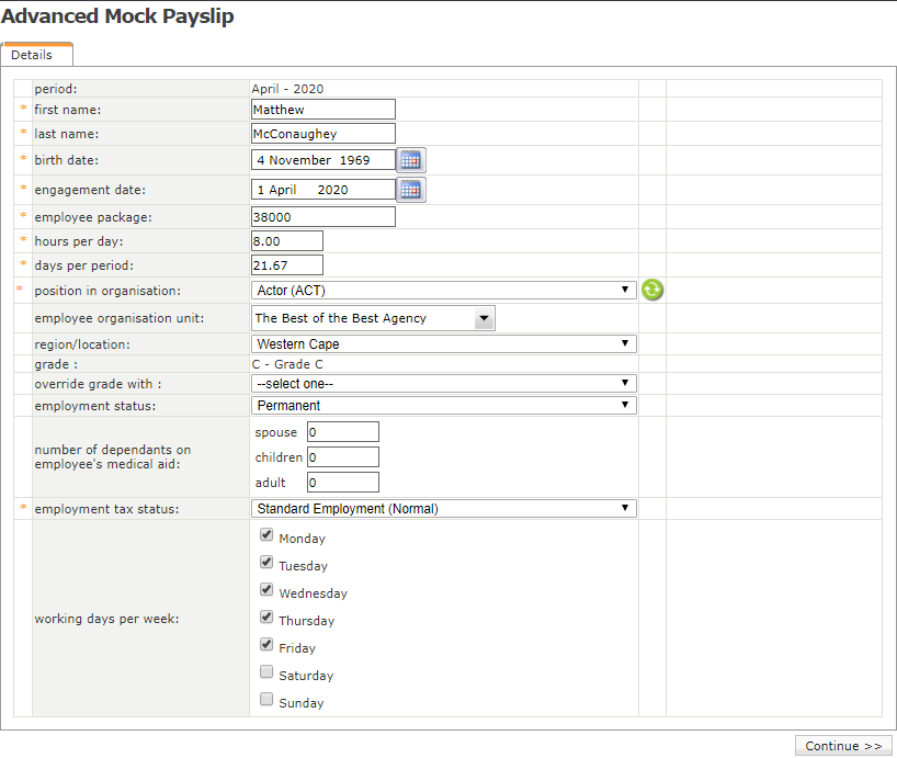 The mock payslip enables you to calculate a prospective employee's net salary without having to do a manual calculation or add the employee to the payroll. All the parameters that can affect the tax calculation has been included on the Create A Mock Payslip screen.