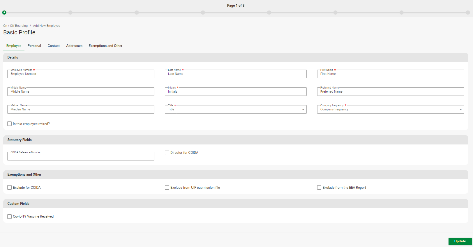 A new employee record can be created by following and completing the workflow on the Add New Employee screen.