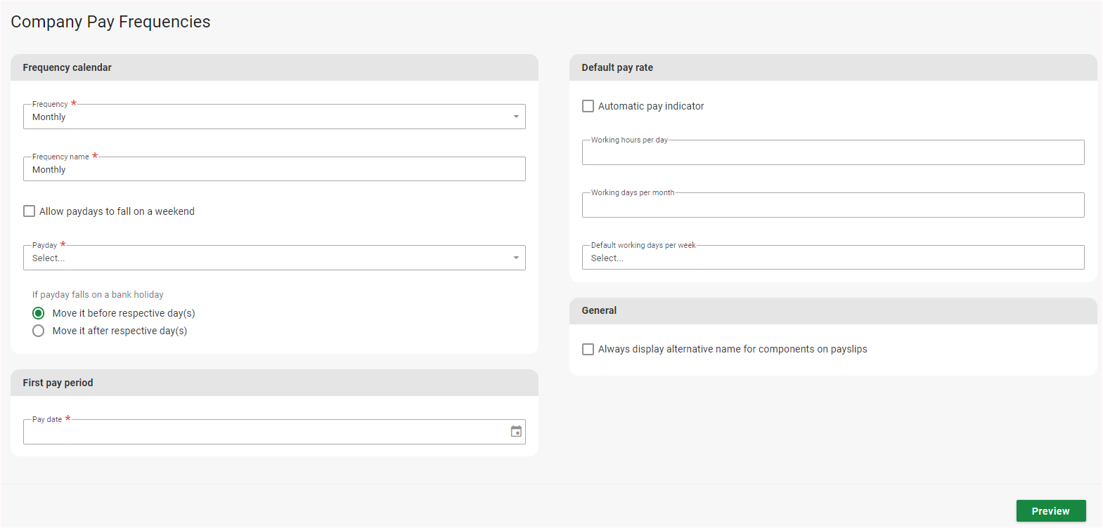 A new frequency (Fortnightly, Monthly, Semi-Monthly or Weekly) can be created on the Pay Frequencies screen by clicking on the "Add Frequency" dropdown button and selecting the type of frequency required. Navigate > Configuration > Payroll > Payroll ...