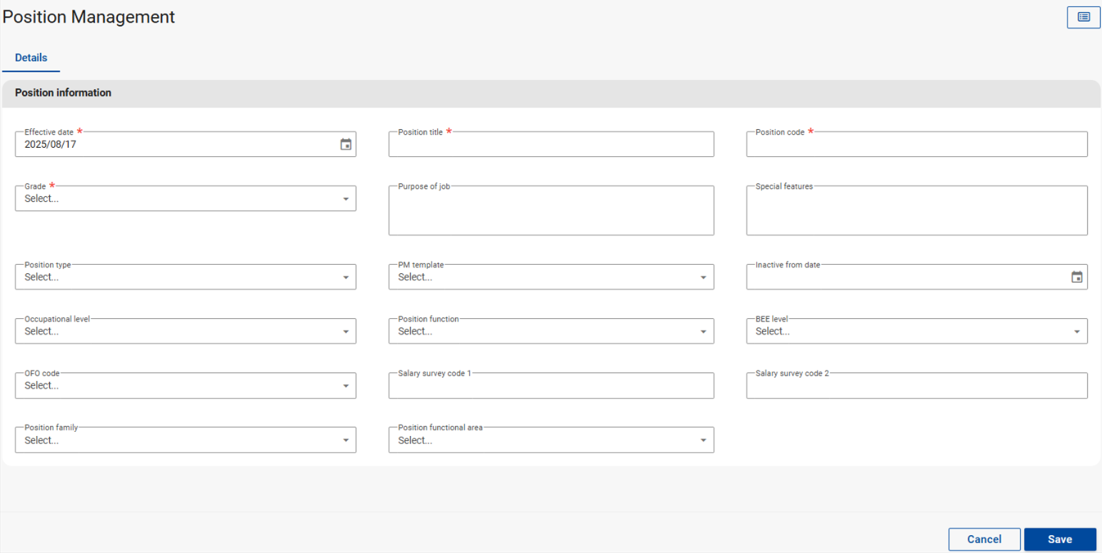 Positions have to be created on company level on the Position Management screen before they can be assigned to an employee record.