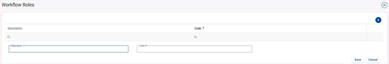 A workflow role is created by selecting the "+ " button on the Workflow Roles screen.