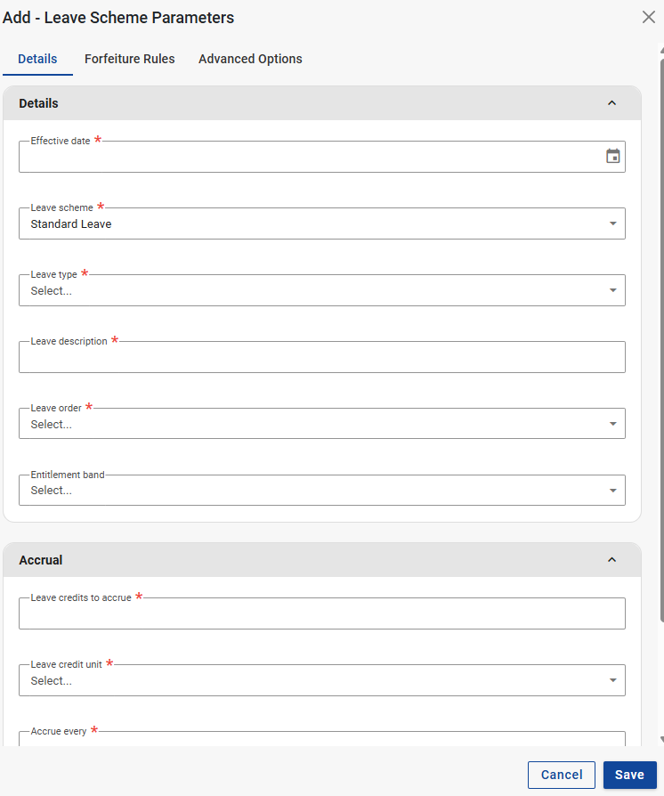 The Lite payroll edition will offer limited Advanced Options on the Leave Scheme Parameters screen.