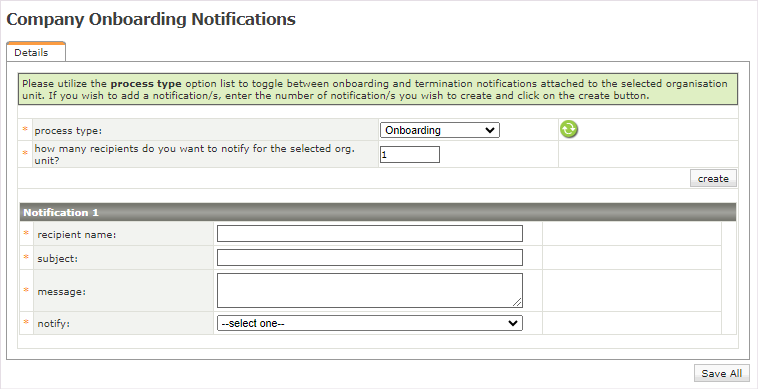 Onboarding notifications allow customers to create onboarding notifications for a specific organisation unit, which will result in recipients receiving notifications generated by the system when an employee starts at the company. Once created, ...