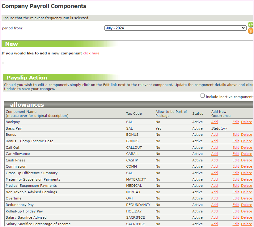 Overview The Company Payroll Components screen stores a library of payslip actions a company requires on employee level. This includes automatic components (that will automatically populate/calculate on the Edit Payslip screen every period), and ...