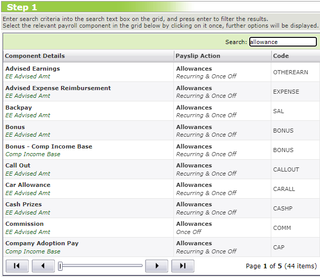 Step 1: Search for and select the desired component from the library of available components. The search can be refined by sorting the information when selecting any of the column headings i.e. Component Details, Payslip Action or Code.