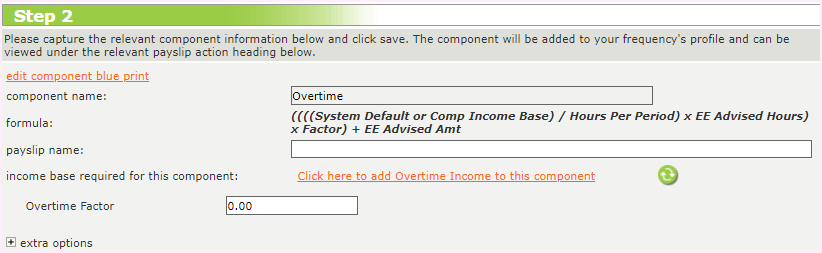 Step 2: Capture the relevant component information (e.g. payslip name, income bases and/or other extra options) and select "Save". The component will be added to your frequency profile and can be viewed under the relevant payslip action.
