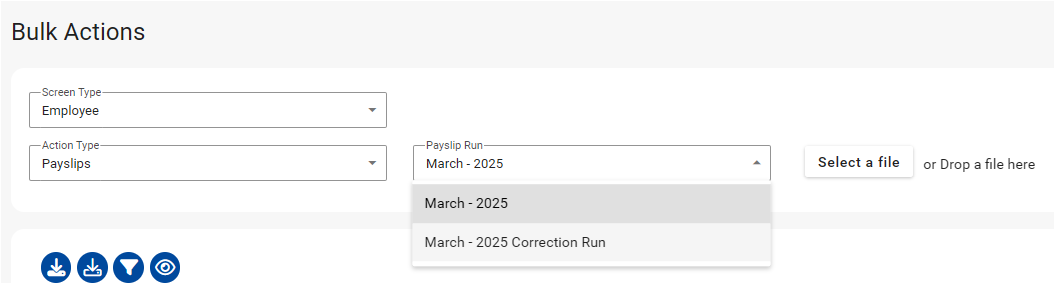 Payslips linked to an open main or interim run can be created via the Bulk Actions screen.
