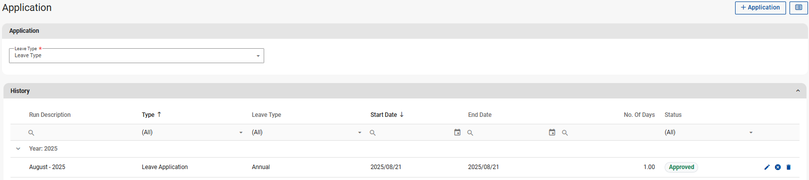 To delete a leave application, select the Bin icon against the applicable leave application on the history grid.