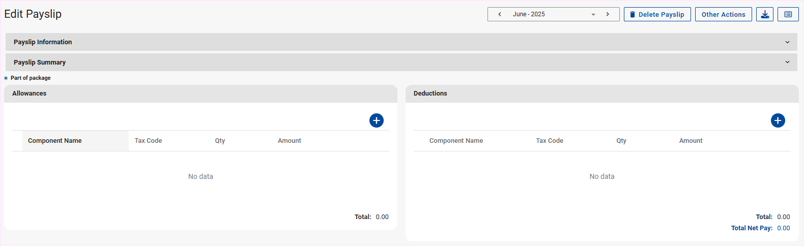 The delete payslip option will only be available once all components are removed.