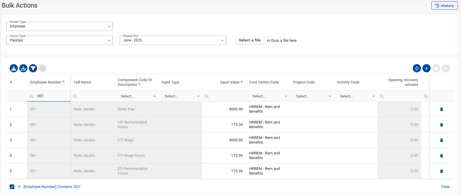Option 3: Alternatively, delete the financial data (components) via the Bulk Actions screen to clear the payslip using the "Delete" icons and the "Save" icon on the right side of the grid. Then select the "Delete Payslip" button on the Edit Payslip screen.