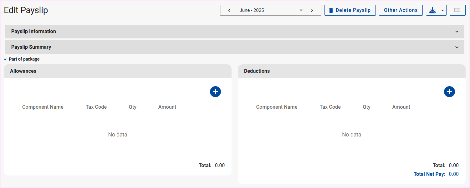 Option 2: Delete the financial data (components) and then select the "Delete Payslip" button on the Edit Payslip screen.