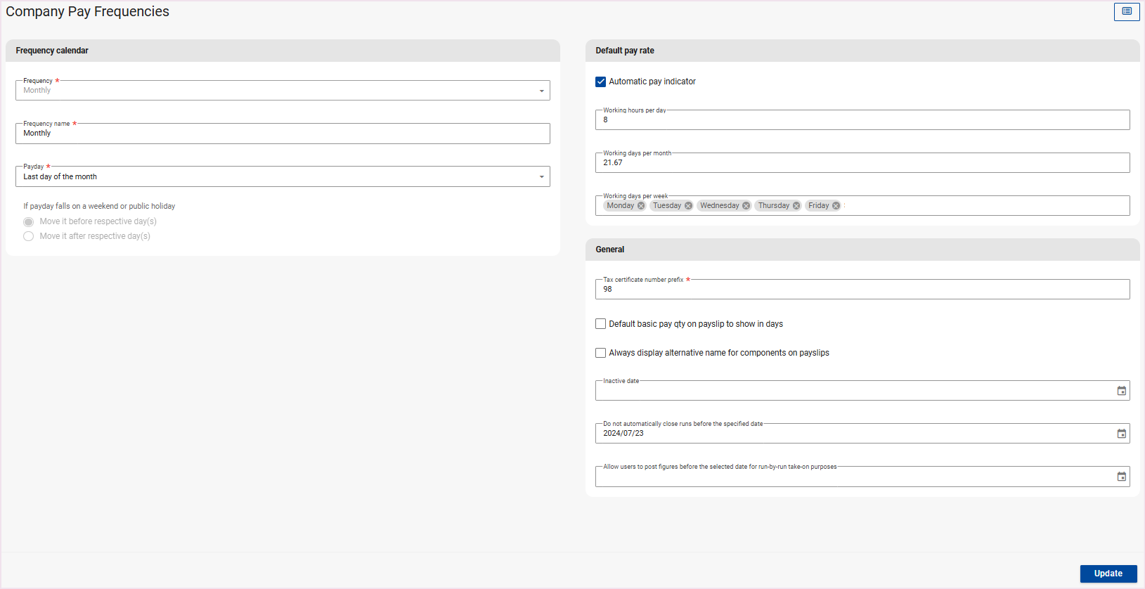 Overview The Payslip Pay Dates are configured when the frequency is created on the system. Based on the selections made during this process, the system will automatically create pay runs and indicate the start and end dates, a description, and the ...