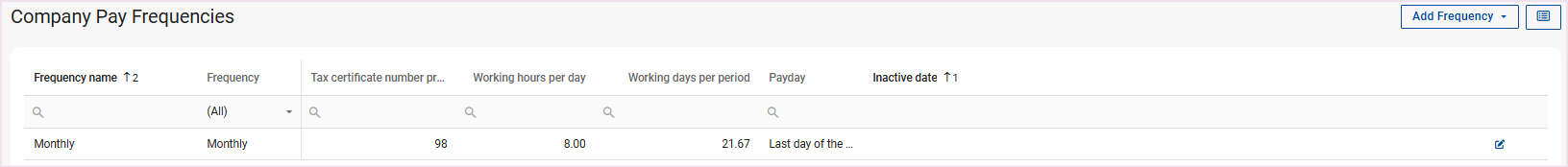 Certain fields of an existing frequency can be edited on the Company Pay Frequencies screen.